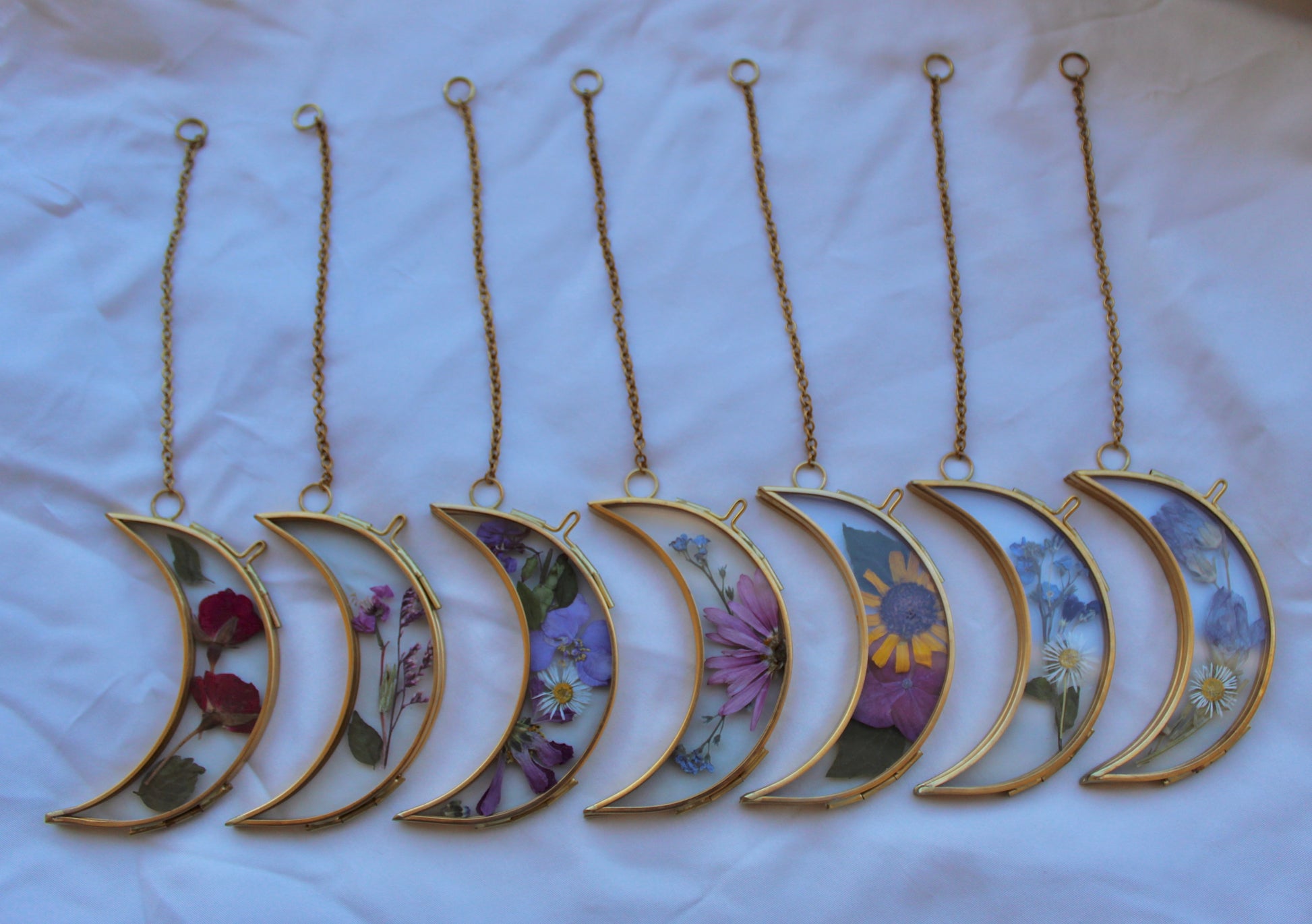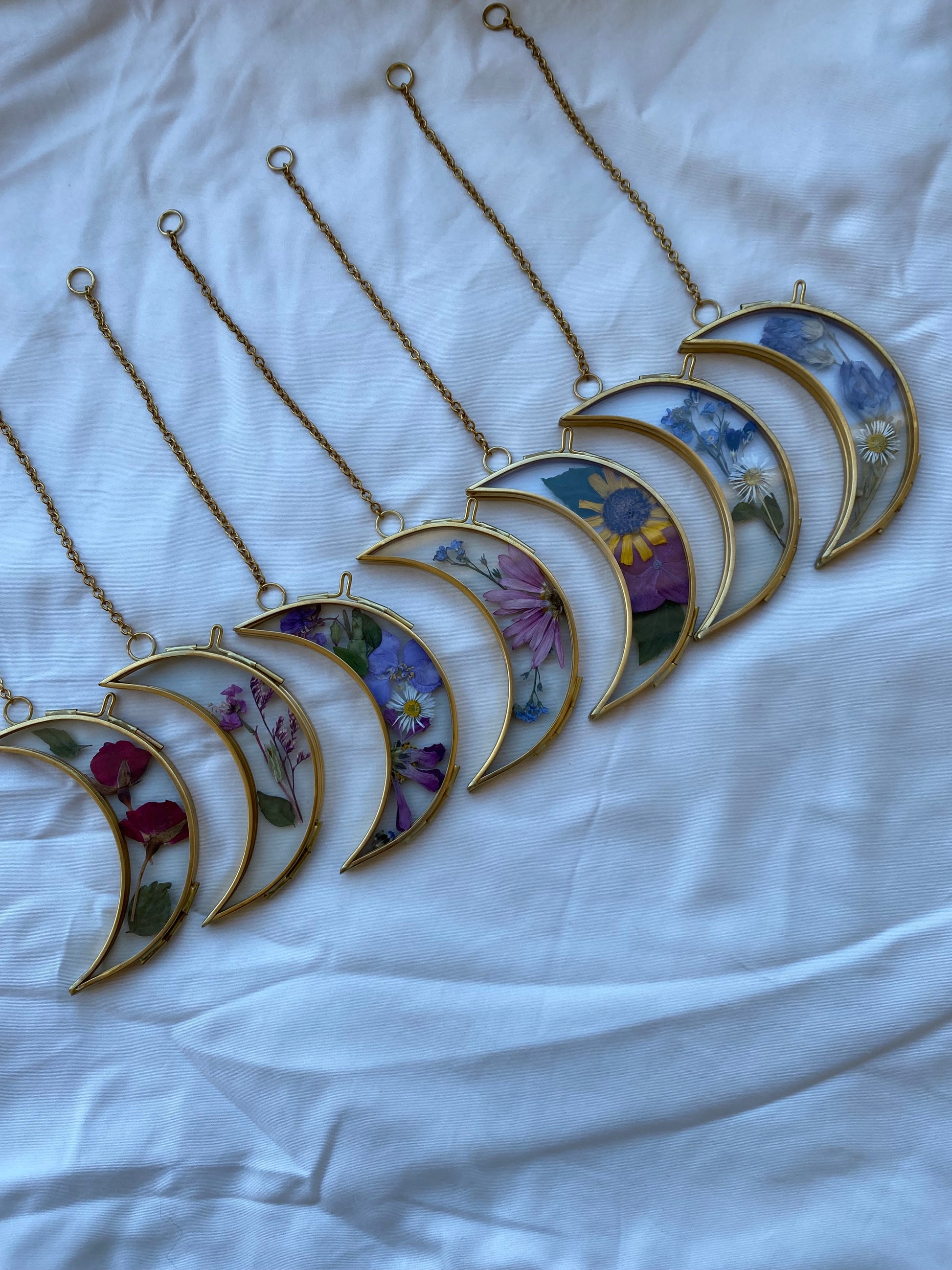 4 inch gold frame moon window charm made with genuine pressed florals.